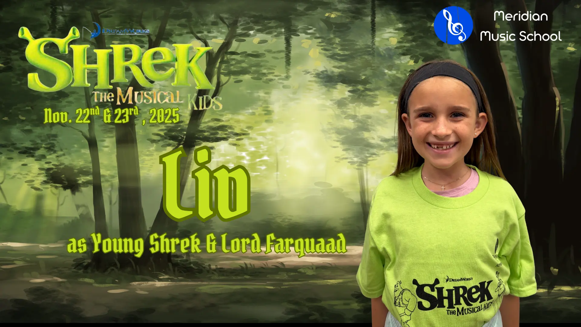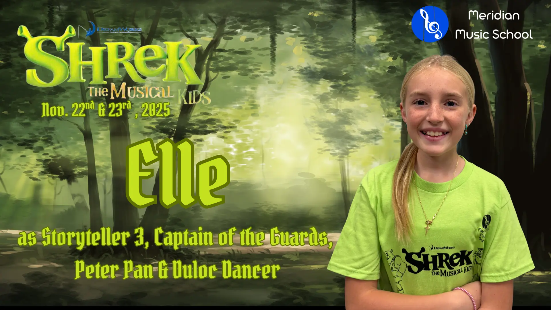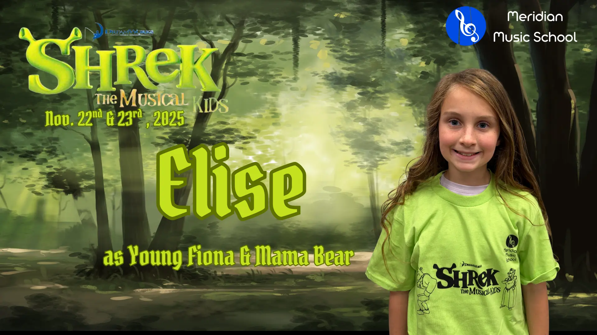 Elise is in 4th grade, and this is her 5th show which has included Aladdin, Little Mermaid, Aristocats, Music Man and of course currently Shrek. When Elise isn’t singing, she is killing it on the soccer field and flipping at gymnastics. Break a leg!