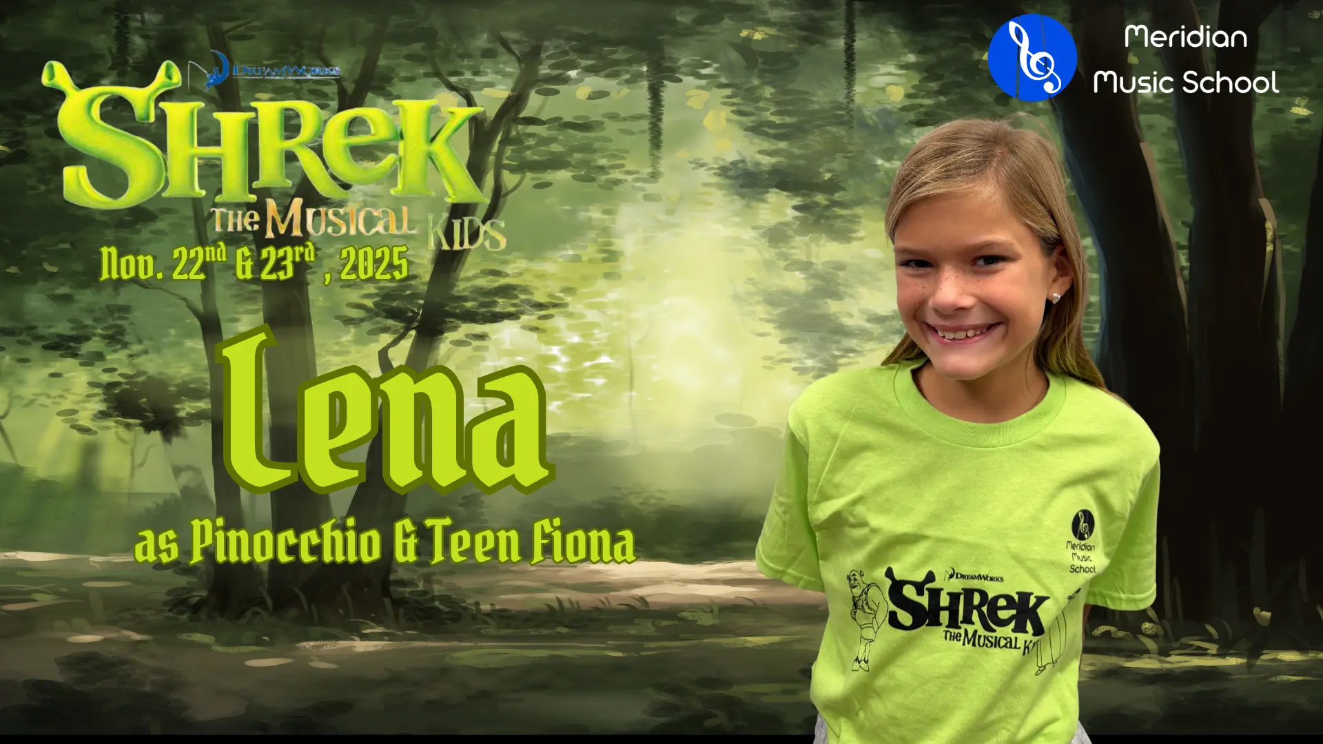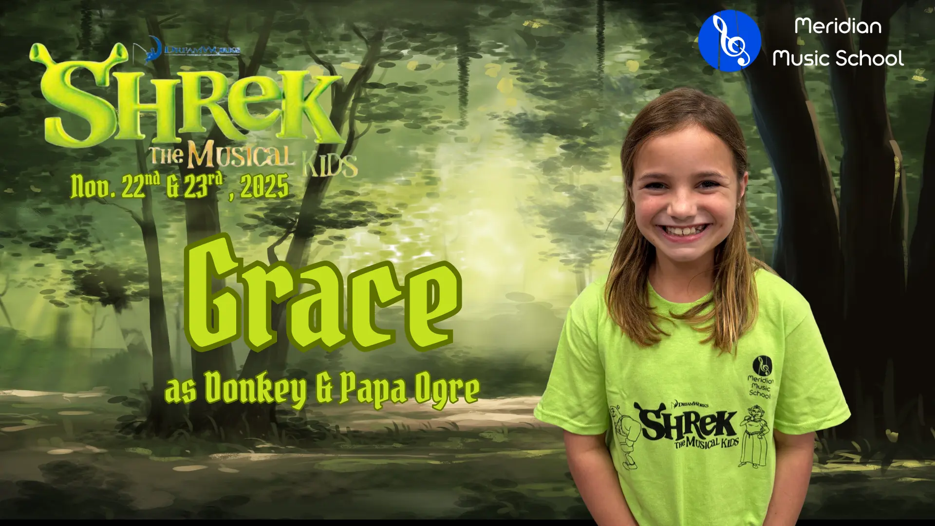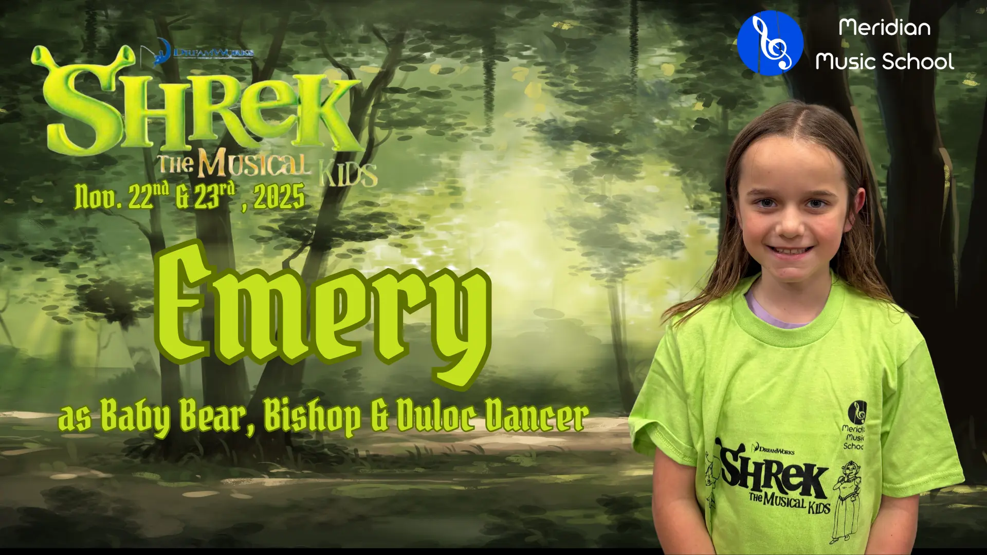 Elise is in 4th grade, and this is her 5th show which has included Aladdin, Little Mermaid, Aristocats, Music Man and of course currently Shrek. When Elise isn’t singing, she is killing it on the soccer field and flipping at gymnastics. Break a leg!